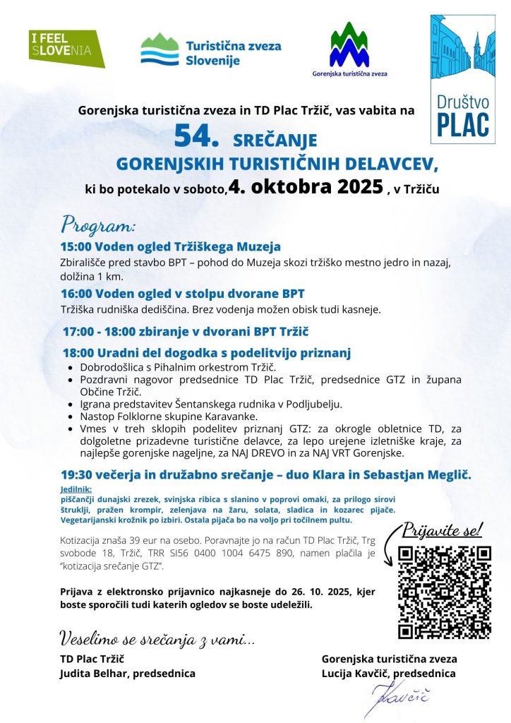 Novice - Prireditve Srečanje GTZ v Tržiču 17. septembra 2025 - By Lucija - predsednica GTZ Vabljeni k prijavi na srečanje gorenjskih turističnih delavcev, 4.10. v Tržiču.